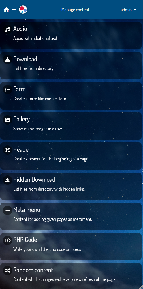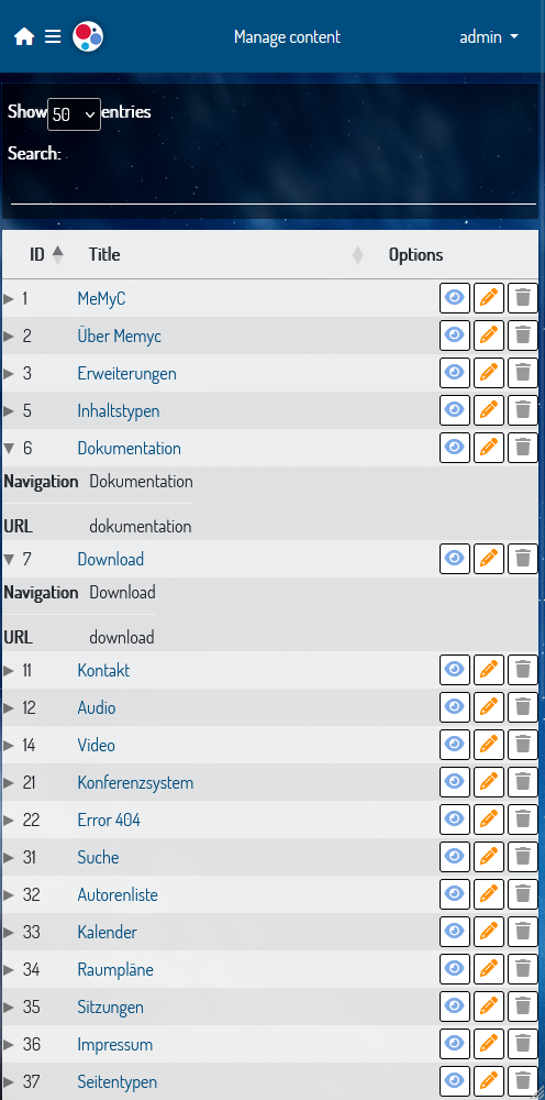 Memyc beinhaltet wie auch TYPO3 eine Vielzahl an Inhaltstypen, die für die Arbeit als Webseitenredakteur keine Wünsche offen lässt